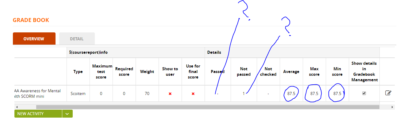 As I said, the "Overview" tab displays the aggregated number of users who passed. You can see the specific users in the "Detail" tab. So if your user has passed, you will see 1 in the overview.haseeb wrote: ↑Wed Oct 31, 2018 5:59 pm My scorm course pass cmi.core.lesson_status = completed do I need to pass cmi.core.lesson_status = passed as well? because after adding scorm activity in GradeBook I am still seeing not passed.