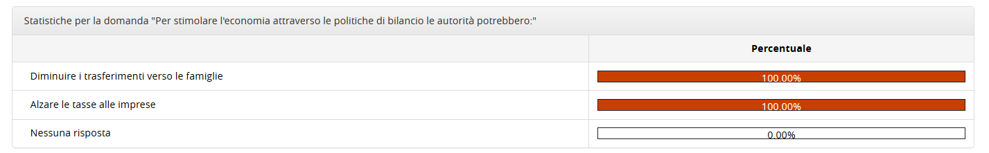 Per alcune domande però vedo come da immagine sottostante: solo le risposte che sono state date almeno una volta (nell'esempio 2) e non tutte le risposte possibili (4), e in più le due risposte citate hanno entrambe il 100%: