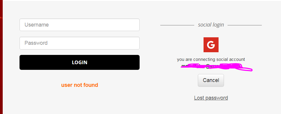 Are there any instructions listed anywhere? I mean I know how to create the OAuth credentials and I did so. But all I get is a "social login" section on the login page. If I click the G I get "you are connecting social account [my email]" with a cancel button. ON the left it says "User not found"