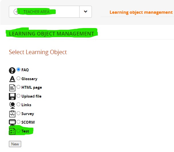After doing this, I logged into my site, created a new course with no content (because i only care about creating a test for myself). I entered the course, selected "teacher area", learning object management, and new learning object. When the list of new objects shows up, I click "test" and "New".