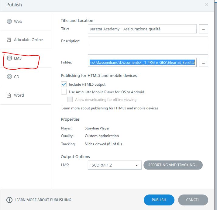 Select "LMS". It doesn't matter if you flag the HTML5 options or not. With reporting and tracking, I normally use Scorm 1.2 (but the system works with Scorm 2004, too), I report to the Lms as "Completed/incomplete" and using the number of slide if I have no quiz. If I do have quizzes, I report as "Passed/Failed" and I use the quiz score. When I am done, I let Storyline zip the output automatically so I am sure I have everything correctly zipped.