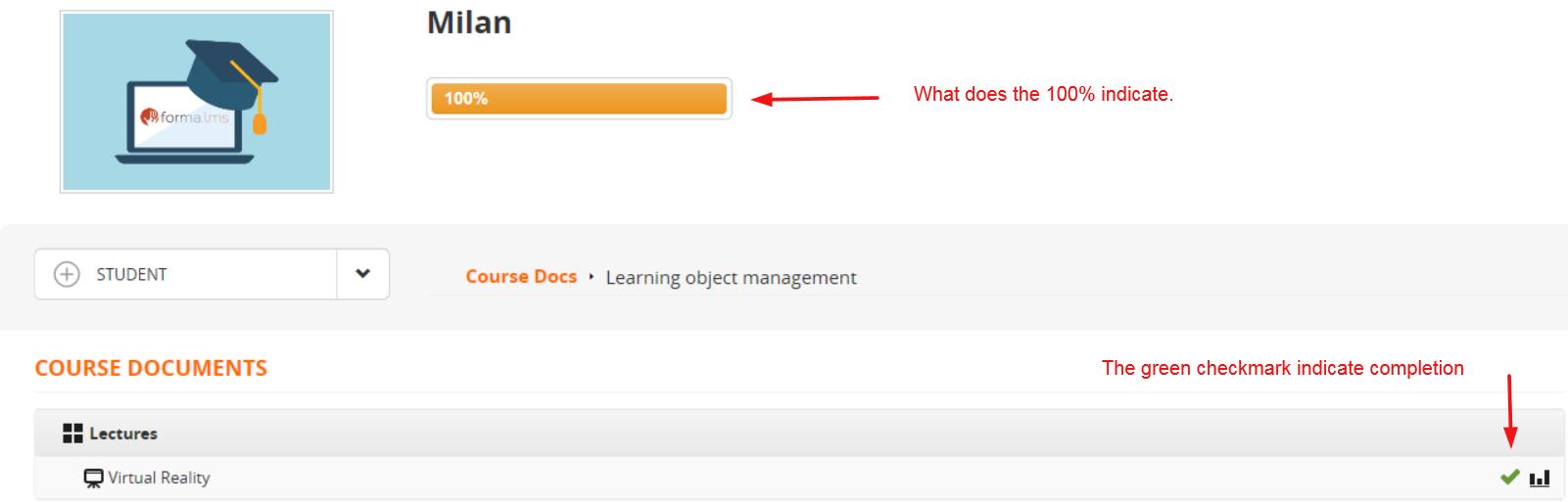Milan course is mark as in progress. Now, in the second image there is check mark that say 100% complete. When you complete the course the indicator should be automatically.